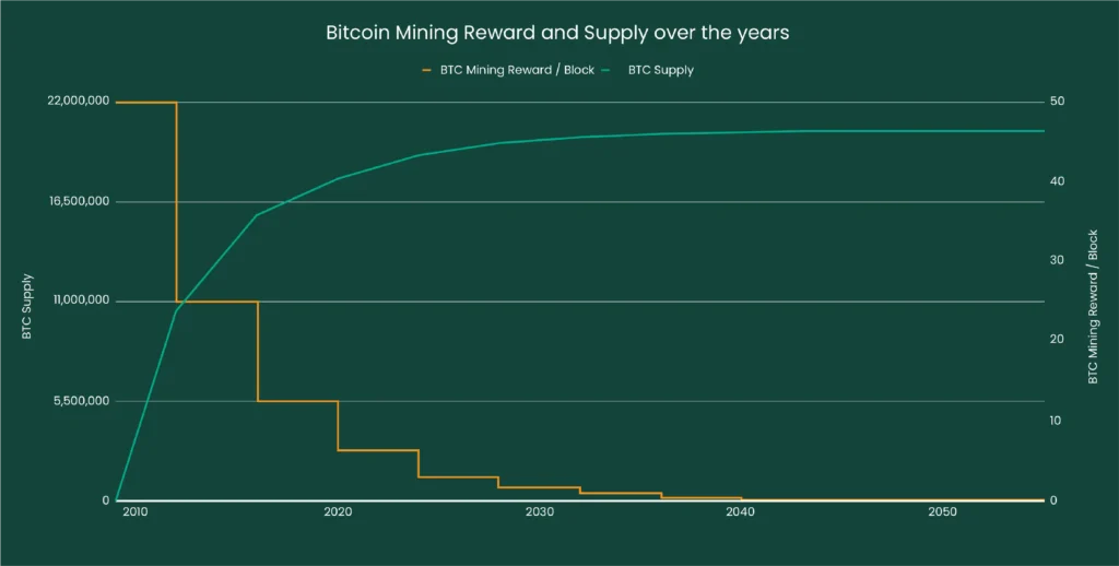 Od pokretanja Bitcoin mreže 2009. godine, ova se nagrada prepolovi svakih 210.000 blokova, što pri prosečnom vremenu od deset minuta po bloku odgovara otprilike jednom u četiri godine.