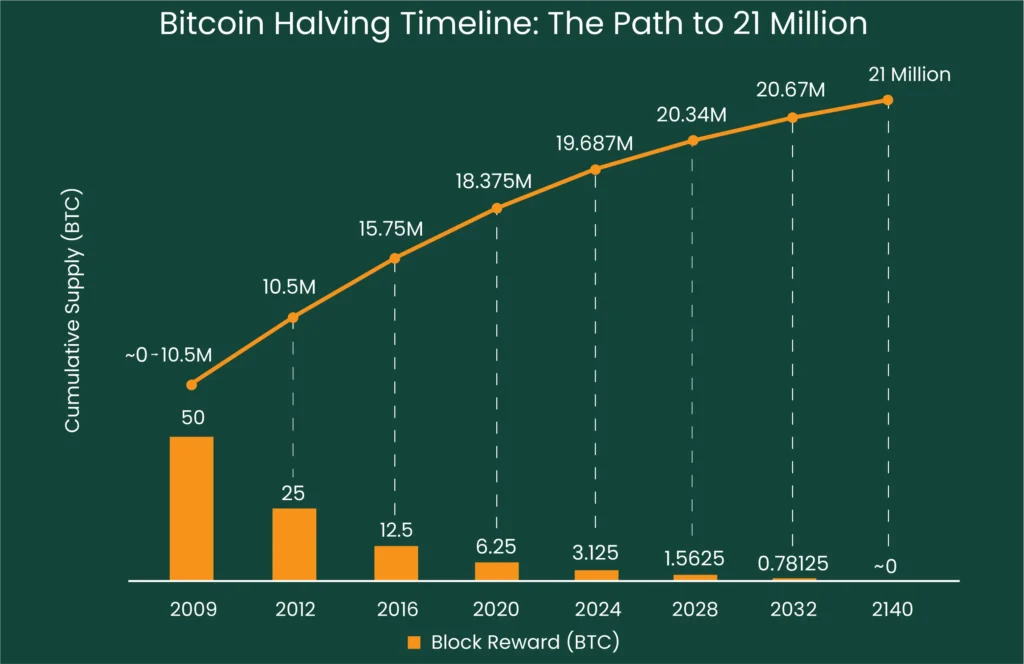 Zbog toga se procenjuje da će se poslednji bitcoin izdati oko 2140. godine, nakon čega će mreža funkcionisati isključivo zahvaljujući transakcionim naknadama koje rudari dobijaju. Na taj način, Bitcoin mreža ostaje matematički precizna, samoodrživa i predvidiva do samog kraja.