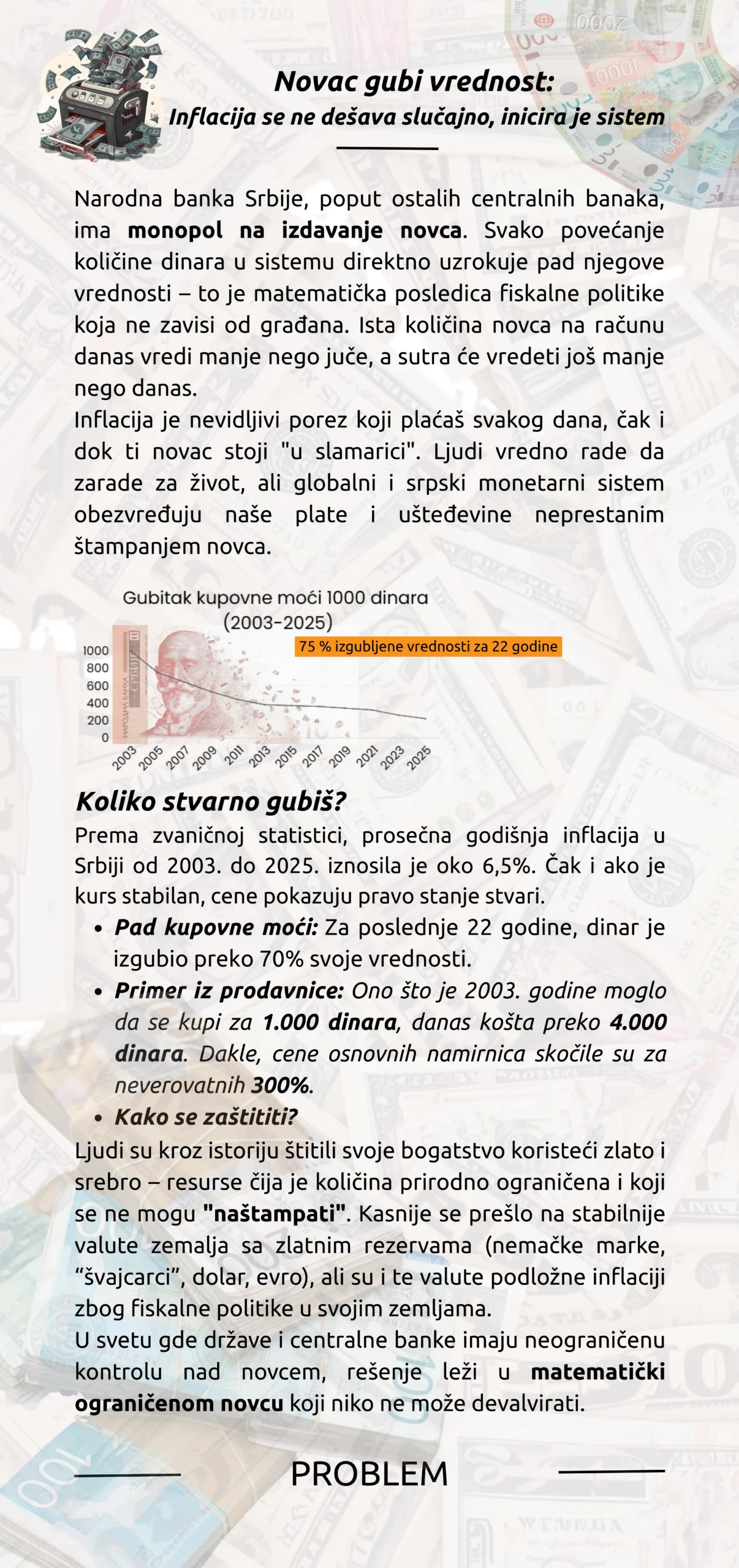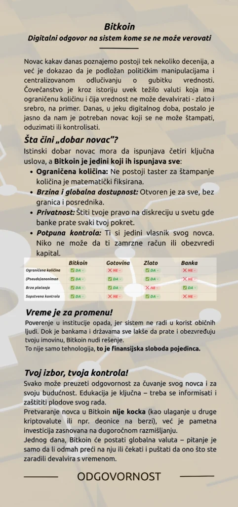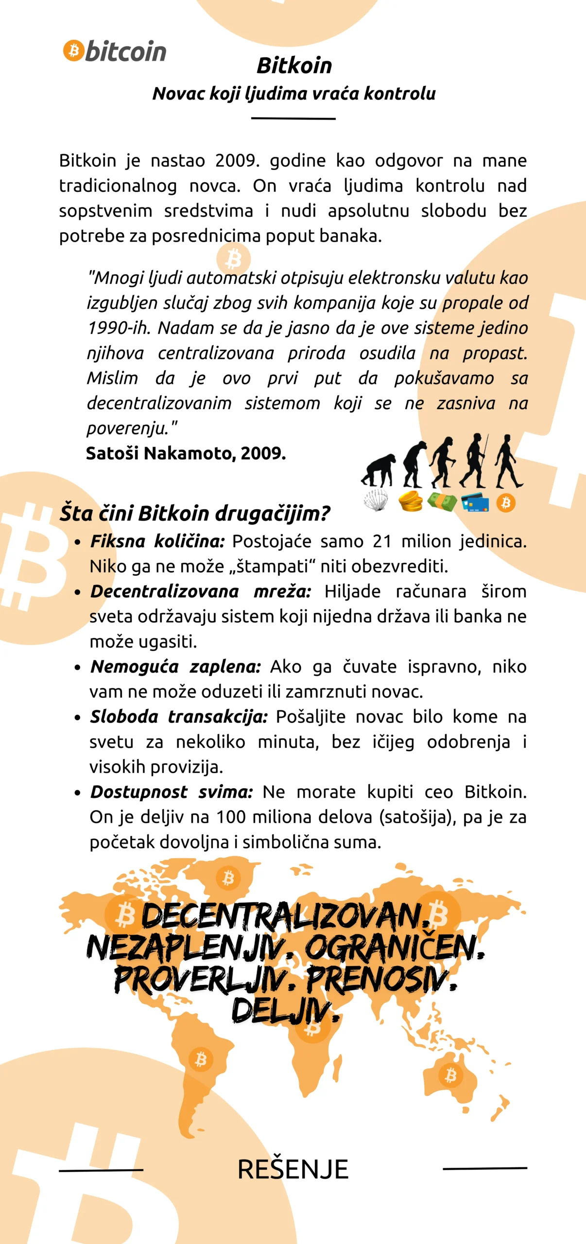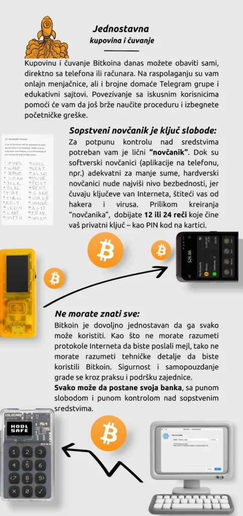 Fokus je na edukaciji o bezbednosti, čuvanju i značaju Bitkoina kao modernog oblika štednje bez nepotrebne stručne terminologije.