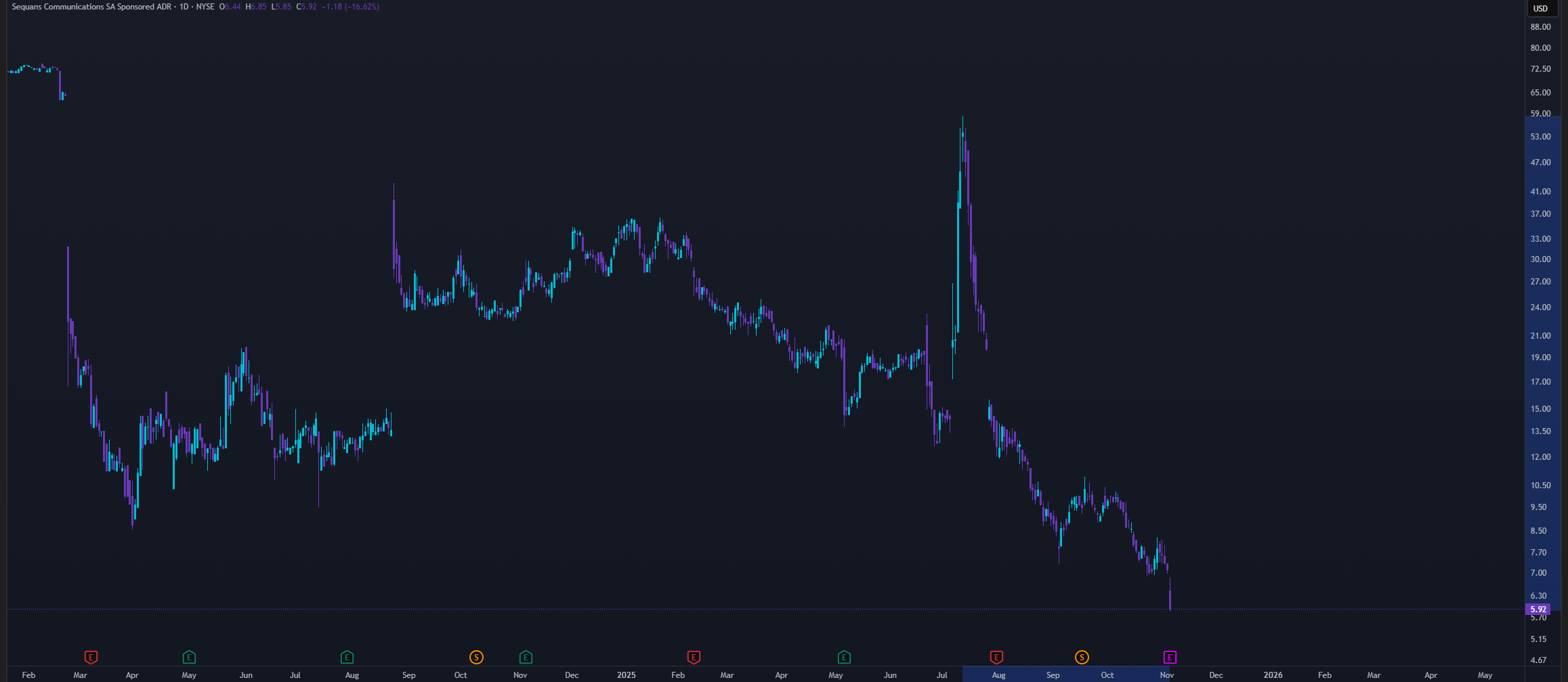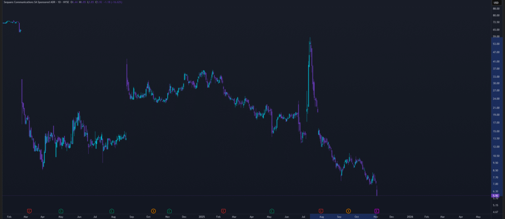 SQNS akcije se trguju ispod nivoa od pre najave Bitcoin strategije. Od vrhunca sredinom jula ove godine, akcije su pale za oko 90%.