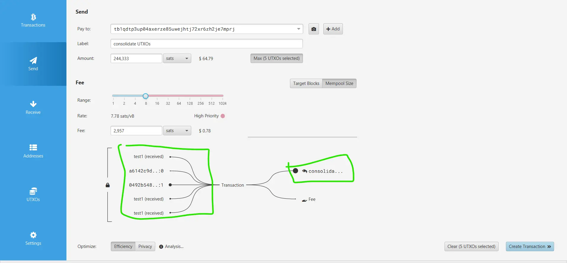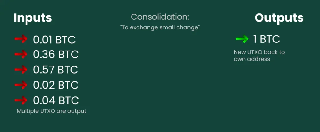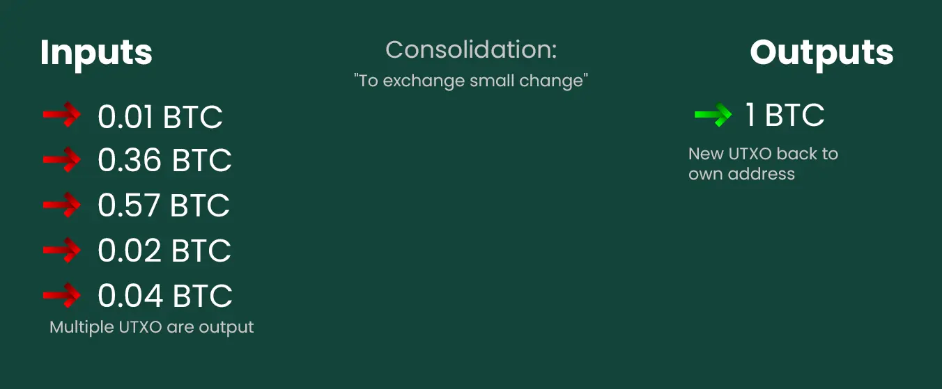 Kada su naknade niske, isplativo je preventivno spojiti više manjih UTXO u jedan ili nekoliko većih. Ovaj postupak naziva se konsolidacija i predstavlja transakciju poslatu samom sebi. Kasnije, kada naknade porastu, štedimo jer smo „spajanje sitniša“ obavili u povoljnijem trenutku.