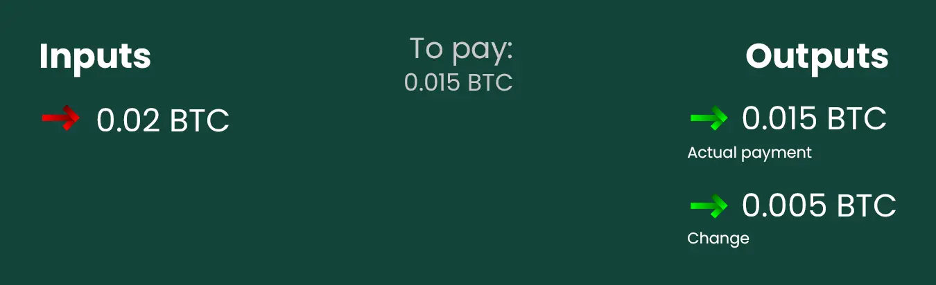 Na prvi pogled izgleda kao da je bitcoin poslat na dve adrese, jer postoje dva outputs. U stvarnosti, jedan od njih je kusur koji se vraća pošiljaocu.