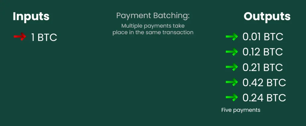 Umesto da za svako plaćanje pravimo posebnu transakciju, više outputs možemo uključiti u jednu. Takva transakcija zauzima više prostora od pojedinačne, ali u celini troši manje resursa jer koristi samo jedan ili nekoliko inputs. Ovo je česta praksa kod menjačnica i brokera.